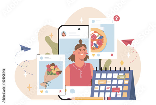 Obraz premium Colorful flat style design showing a woman on a smartphone screen surrounded by social media posts, calendar, and paper planes on a white background. Vector illustration