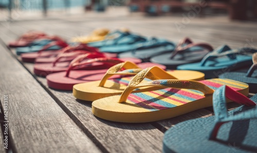 Fototapeta premium Colorful flip flops lined up on a wooden deck, summer vacation concept