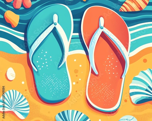 Naklejka premium Colorful flip-flops on a sandy beach.