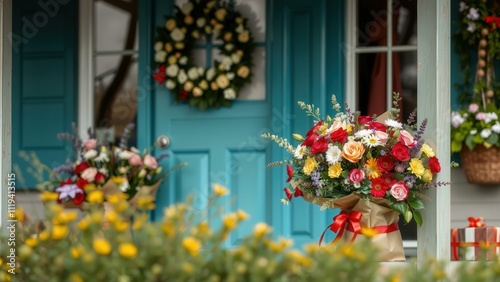 © SimpleDesignStudio, Fototapeta premium Colorful Floral Arrangements and Wreath on a Blue Door, Perfect for Home Decor and Gift Ideas