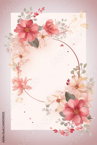 © Riocool, Fototapeta premium Colorful floral decoration illustration background template, creative arrangement of nature and flowers. Good for banner, wedding card invitation draft, greetings, and design element. Generative AI.