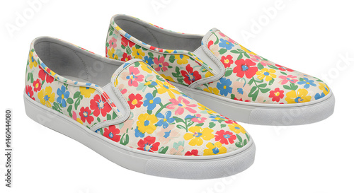 © Creative Transparent, Obraz premium Colorful floral slip-on shoes displayed against a white background, perfect for casual wear in spring or summer