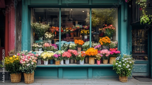 Fototapeta premium Colorful Flower Arrangement Displayed in Front of a Store Window