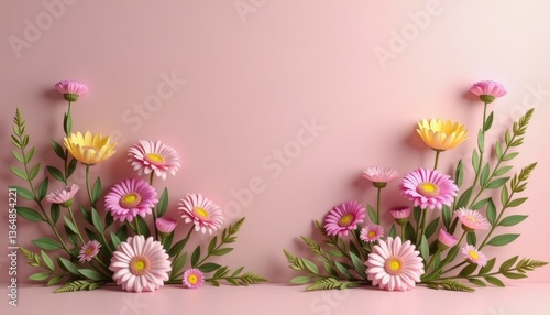 © yuntunen, Fototapeta premium Colorful flower arrangement on a pastel pink background