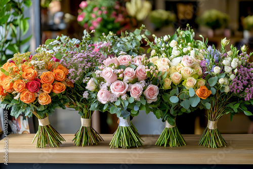 © Stock Love, Fototapeta premium Colorful flower bouquets displayed on a wooden counter in flower shop during, bright sunny day. Various flower bouquets in vibrant colors in floral shop for birthday, wedding, mother's day