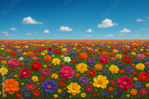 Fototapeta premium Colorful Flower Field Stretches Under a Bright Blue Sky With Fluffy White Clouds