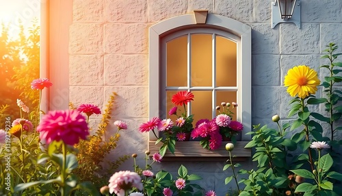 © ChaokuayOfficial, Fototapeta premium Colorful Flower Garden with Bright Blooms Next to a Charming Window on a Sunny Day