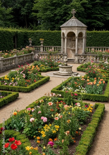 Naklejka premium Colorful Flower Garden with Stone Gazebo