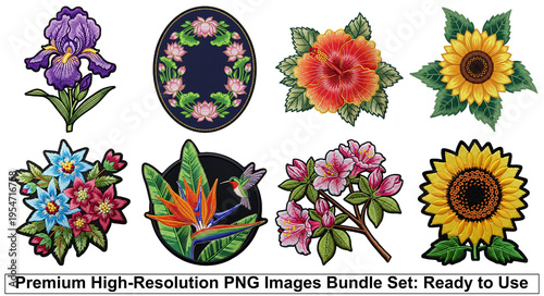Fototapeta premium Colorful flower patches bundle isolated on a transparent background