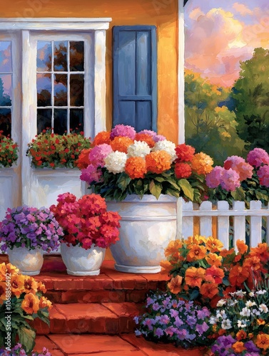 Fototapeta premium Colorful Flower Pots Brighten Up a Charming Home Entrance