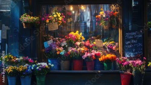 © Katty, Fototapeta premium Colorful flower shop with assorted vibrant bouquets in buckets inside window display, illuminated by warm lighting
