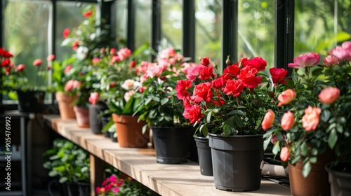 © Prostock-studio, Fototapeta premium Colorful flowering plants in pots are arranged on wooden shelves, showcasing a variety of blooms in a bright greenhouse filled with natural light.