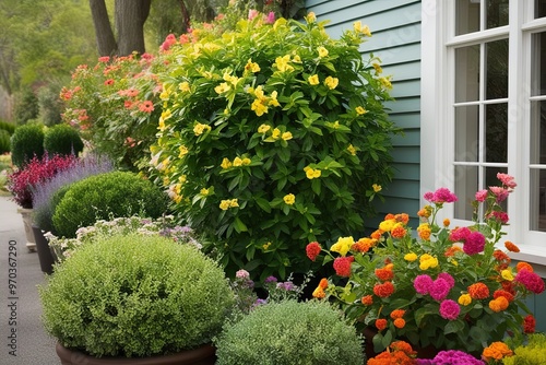 © Michael, Obraz premium Colorful Flowering Shrubs and Vibrant Greenery for a Joyful Garden Corner