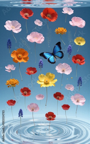 Obraz premium Colorful flowers and a blue butterfly float gracefully against a serene,...