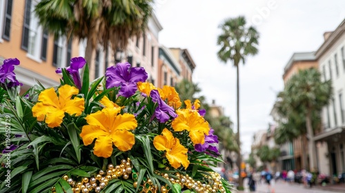 © peacehunter, Fototapeta premium Colorful Flowers and Beads on Mardi Gras Float in Vibrant Festive Parade Atmosphere