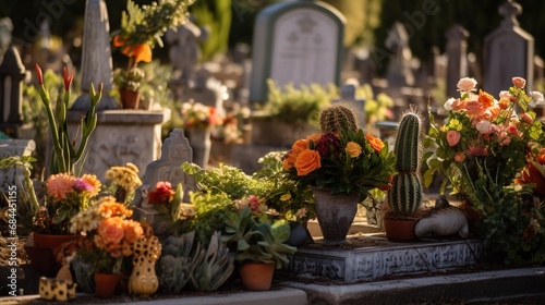 © Randu, Fototapeta premium Colorful flowers and cacti on a grave in a cemetery
