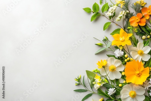 © Jenjira, Fototapeta premium Colorful flowers and leaves arranged on a light background.