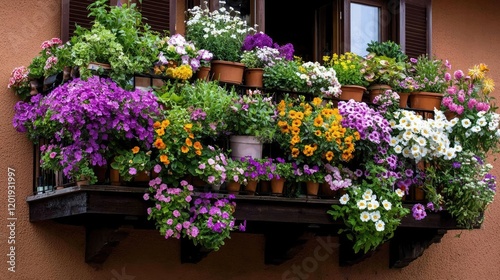 Fototapeta premium Colorful flowers bloom on a balcony overlooking a building