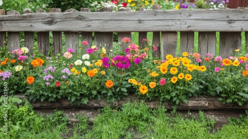 Fototapeta premium Colorful Flowers Blooming Along a Rustic Wooden Fence