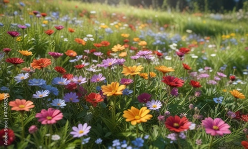 Fototapeta premium colorful flowers blooming in a lush meadow on a sunny summer day, serene,