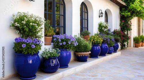 Naklejka premium Colorful flowers growing in blue ceramic pots decorating a white mediterranean house
