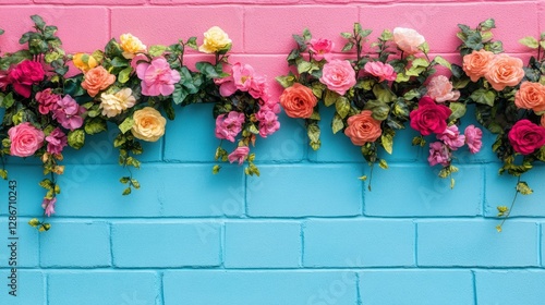 © Diffin, Fototapeta premium Colorful flowers in pink and yellow beautifully drape over a textured blue brick wall, creating a vibrant and artistic display of nature and architecture.
