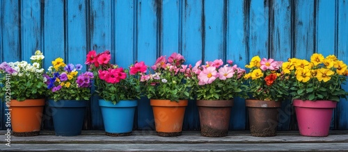 Fototapeta premium Colorful flowers in pots against a blue wooden background.