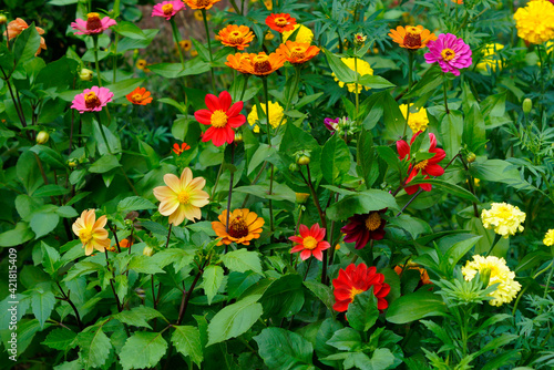 Fototapeta premium colorful flowers in the garden, dahlias, marigolds, yellow, orange, pink and red.