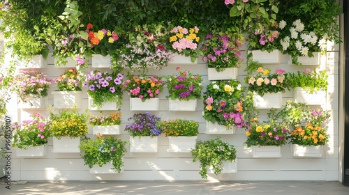 Naklejka premium Colorful Flowers in White Planters on White Wall