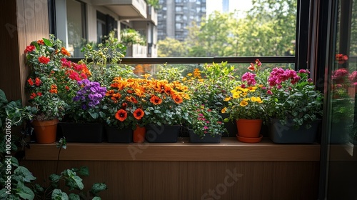 Fototapeta premium Colorful Flowers on Balcony Windowsill
