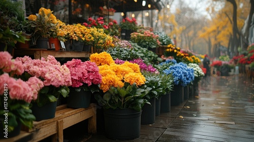 © Aziz, Fototapeta premium Colorful flowers on display at an outdoor market on a rainy day.