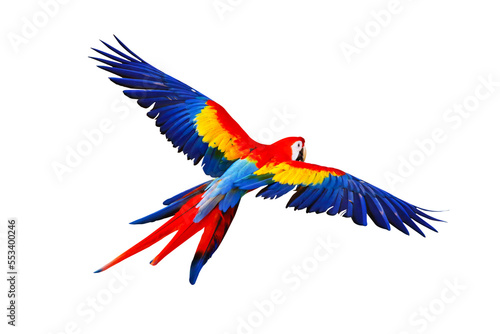 © Passakorn, Fototapeta premium Colorful flying parrot isolated on transparent background.