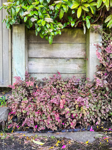 © Natalia, Fototapeta premium Colorful Foliage Along Weathered Wooden Planter