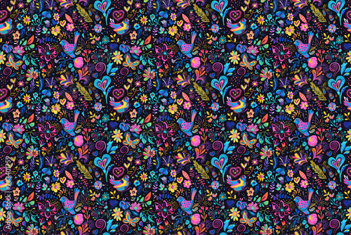 Fototapeta premium Colorful folk art pattern with birds and hearts on dark