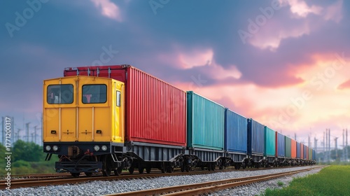 © pinporn manosri, Fototapeta premium Colorful Freight Train Moving Along Rails at Sunset with Dramatic Sky and Power Lines in the Background, Symbolizing Transportation and Cargo Shipping