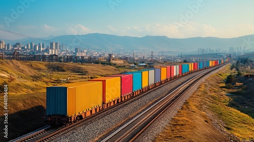 Fototapeta premium Colorful freight train on railway tracks with city view.