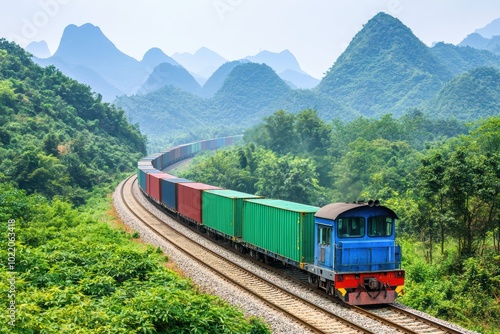 Obraz premium Colorful freight train traveling through mountainous landscape under clear...