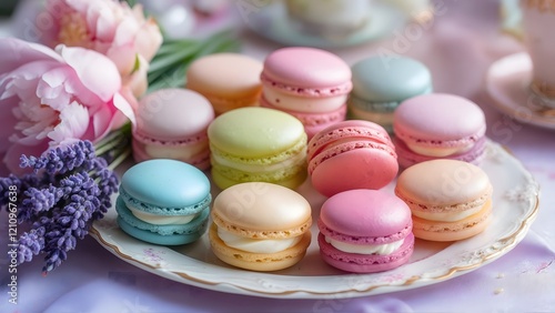 © PixelCraft, Obraz premium Colorful French Macarons on a Decorative Plate with Flowers