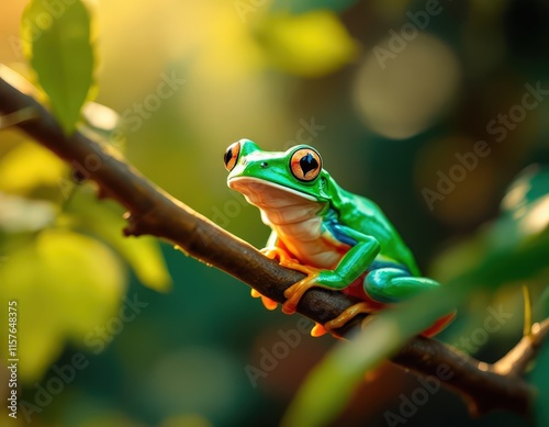 © Katsyarina, Naklejka premium Colorful frog sitting on leaf in vibrant garden. Cute animal for Earth Day, spring, and nature themes. Great for posters, cards, and invitations.