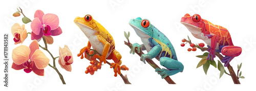 © Lifia, Fototapeta premium Colorful Frogs and Orchids Isolated on Transparent Background in Artistic Style