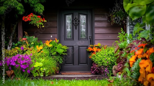 © Puasa, Fototapeta premium Colorful front door, lush garden