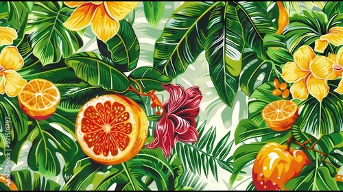 Naklejka premium Colorful fruit and tropical flowers create a lively atmosphere in a vibrant...