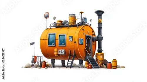 Fototapeta premium Colorful futuristic house with rounded design, equipped with numerous gadgets and a chimney, set against a bright background.