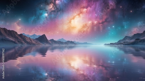 © Sara, Fototapeta premium Colorful Galaxy Reflection on Water with Mountains - Serene Space Landscape