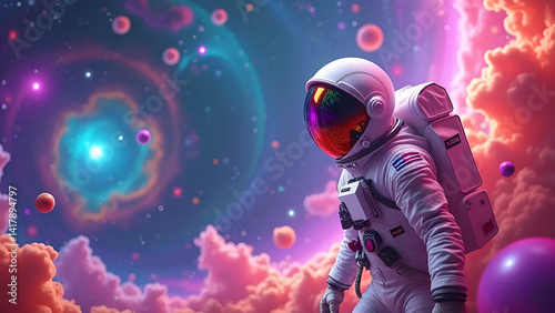 Fototapeta premium Colorful Galaxy with Astronaut and Bubbles on Alien Planet – Fantasy Space Art