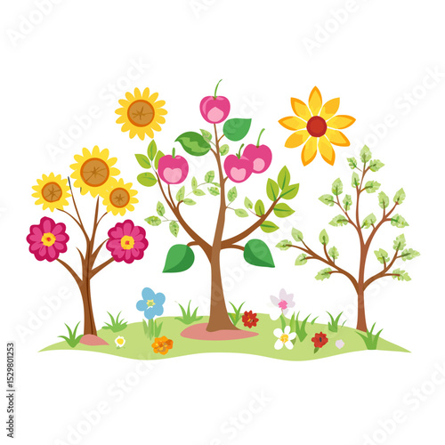 Fototapeta premium Colorful garden illustration with sunflowers, fruit trees, and flowers on white background