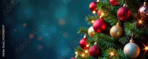 © Jame, Fototapeta premium Colorful garlands adorn the Christmas tree's height, shining stars, colorful garland, festive colors