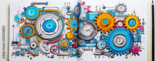 Obraz premium Colorful gears and mechanical elements in an artistic sketch spread across a notebook page