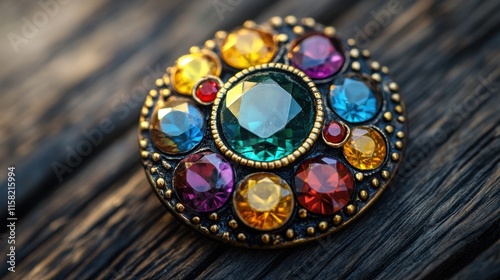 Obraz premium Colorful Gemstone Brooch Rests on Dark Wood