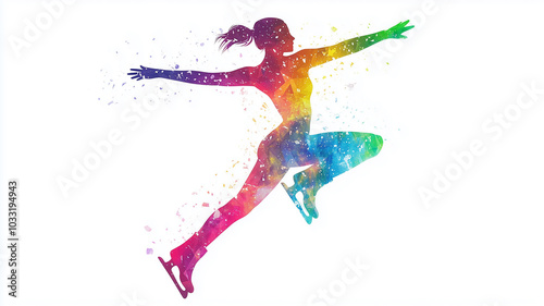 © Dirk, Naklejka premium Colorful geometric abstract complete silhouette figure skating woman isolated on white background. Talented woman figure skating, winter sports, design element for poster or banner.